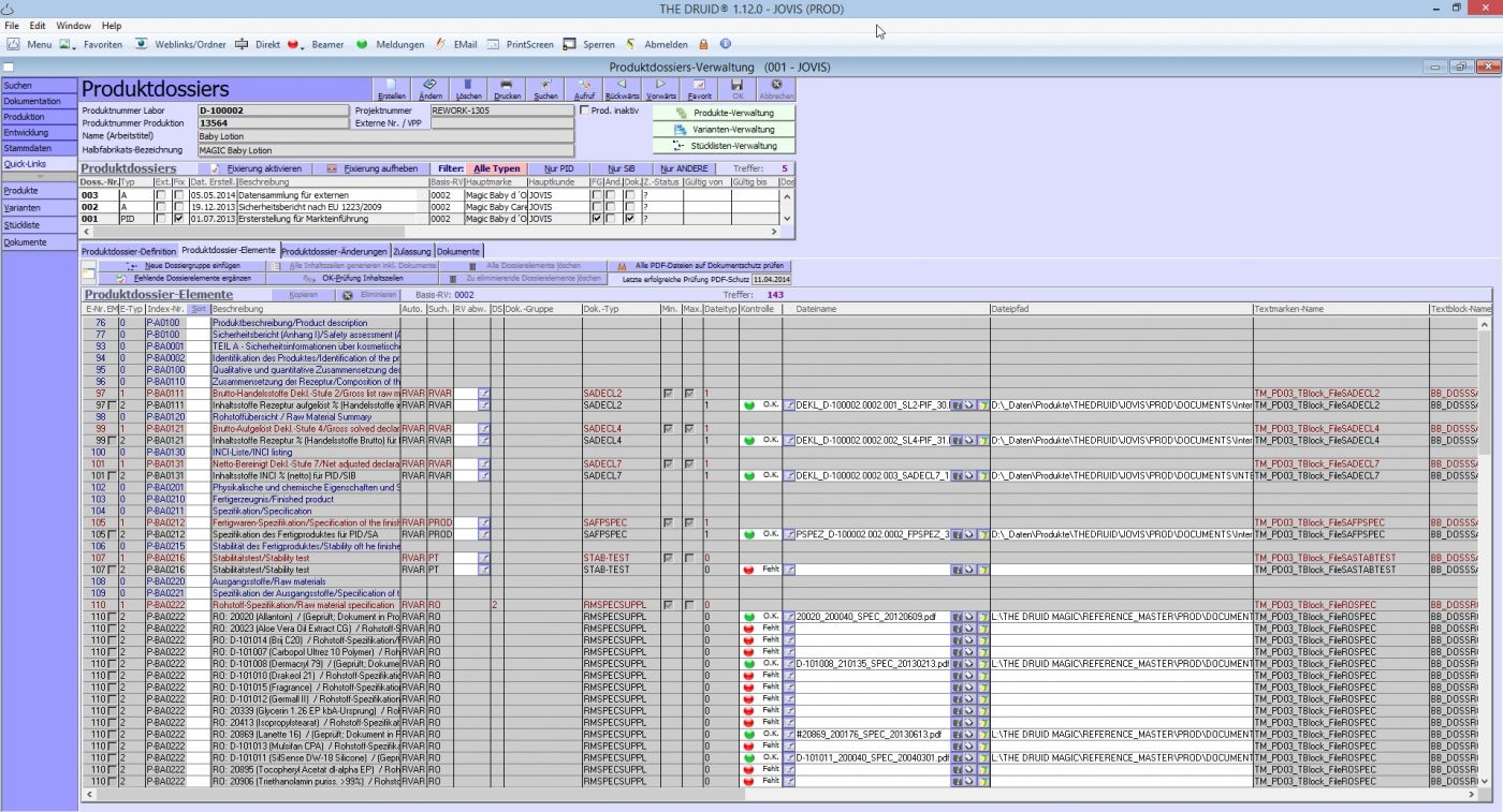 So sehen die Masken für die Erstellung von Dossiers wie Produktinformationsdateien und Sicherheitsbewertungen, die Verwaltung von Produkttests oder die Erfassung von Rezepturen in THE DRUID aus.