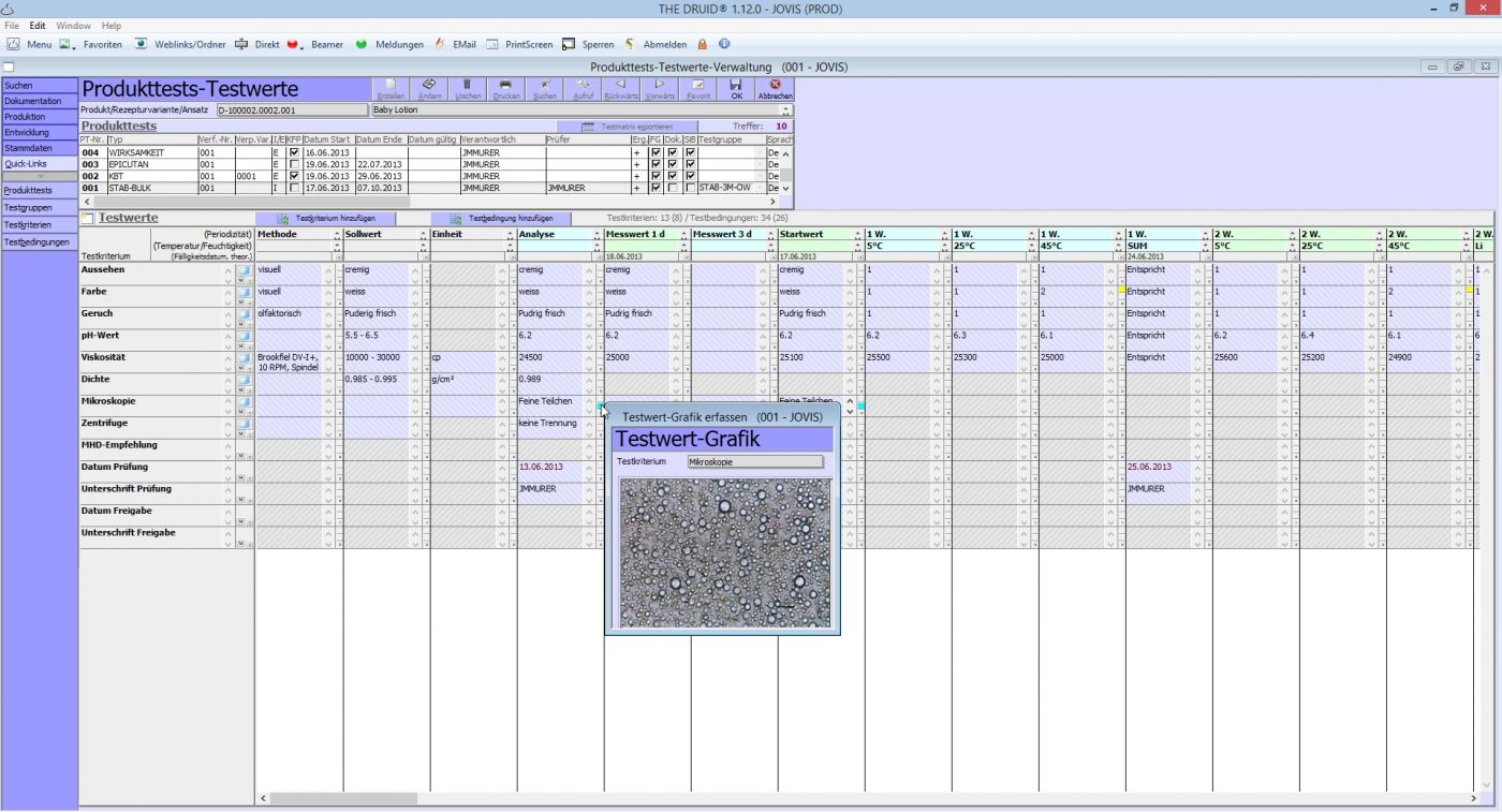 Die Produkttest-Testwerte-Verwaltung – der richtige Ort, um sämtliche Arten von Tests abzubilden; vom Stabilitätstest des Bulks über die Prüfung der Verpackungsverträglichkeit bis hin zu mikrobiologischen Tests oder Wirkungsnachweisen.